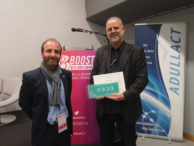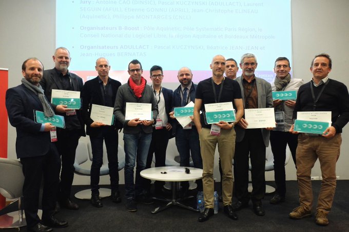 The results were announced on Tuesday, November 6th, 2018, at an award ceremony held during the 1st B-Boost open source convention in Bordeaux, France. The evening started with a round table dedicated to the labeled communities (or in the process of being labeled). Matthieu ROUVEYRE (Gironde), Didier GALLAND (CA du Puy-en-Velay), Pierre LÉVY (city of Paris) and Daniel MARÉCHAL (city of Rennes) were present to talk about their approach in favour of open source, and the projects in progress within their community.