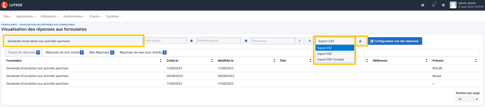 In the list of form responses (Forms – Form response visualization), filter by the name of the concerned form, select the export type (Export CSV, Export PDF, or Export Complete PDF which includes attachments) and click the export button download.